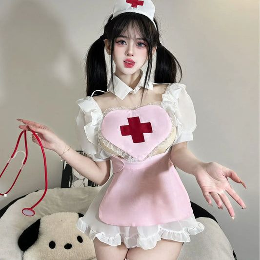 Naughty Nurse Outfit - Pink Sheer Dress with Cross Apron & Headband PPF0308